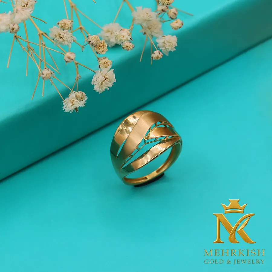 انگشتر طلا کیمیا ساختهشده از طلای ۱۸ عیار با طراحی خاص و تراشهای زیبا، مناسب برای استفاده روزمره و مجالس رسمی.